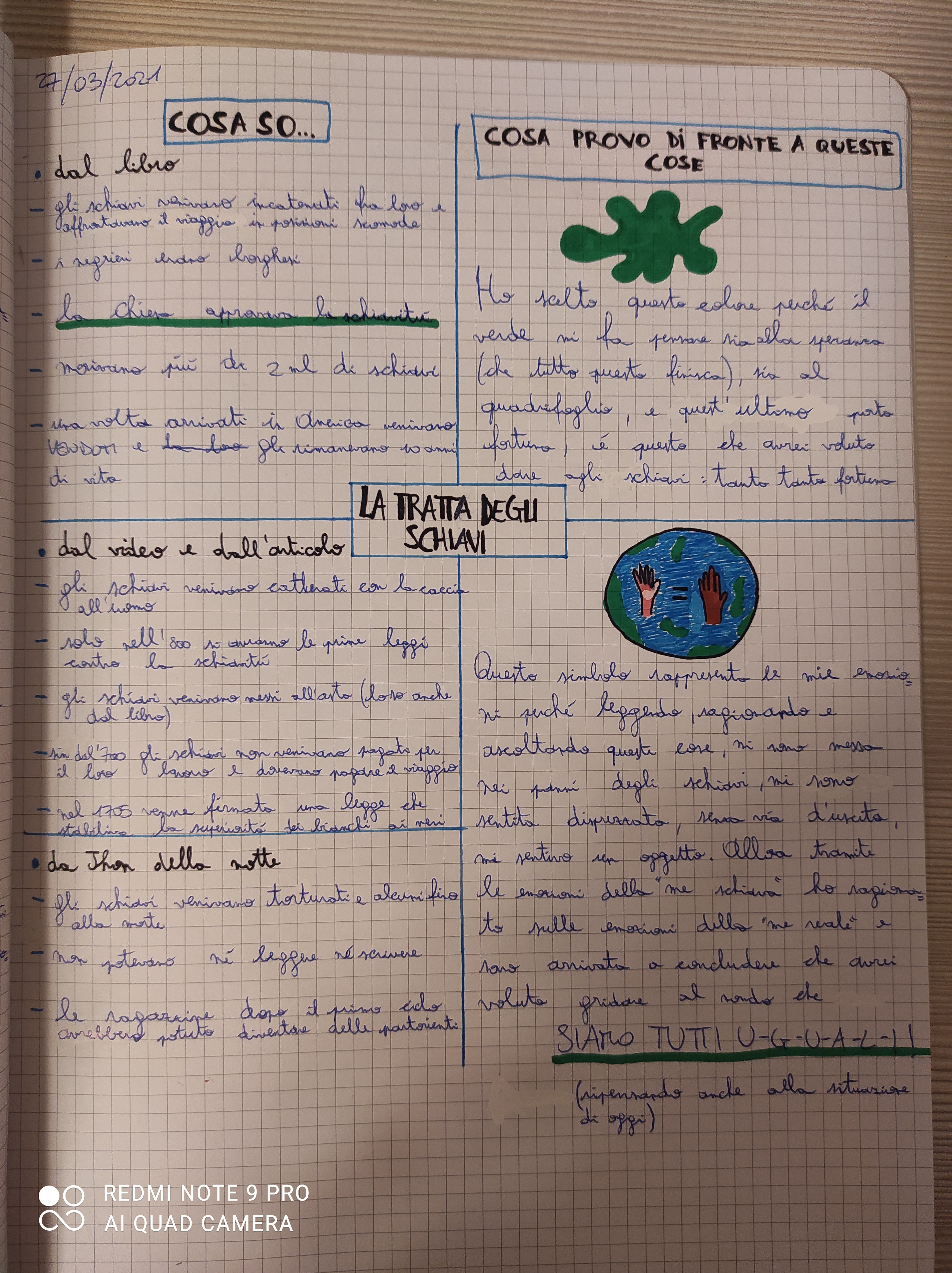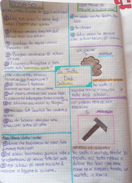 La consegna: mettendo a frutto la tua esperienza di lettore strategico dedica una pagina del tuo quaderno di storia alla tratta degli schiavi. Individua nel libro e tra le tue conoscenze le informazioni chiave che pensi siano necessarie per padroneggiare questo argomento ed associa ad esso – o al tuo sentire di fronte ad esso – un’immagine e un simbolo spiegando le tue scelte.
