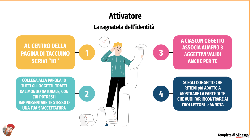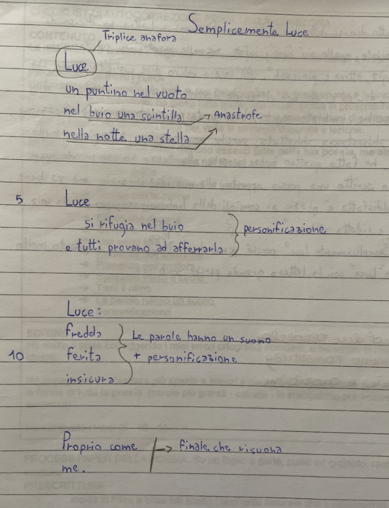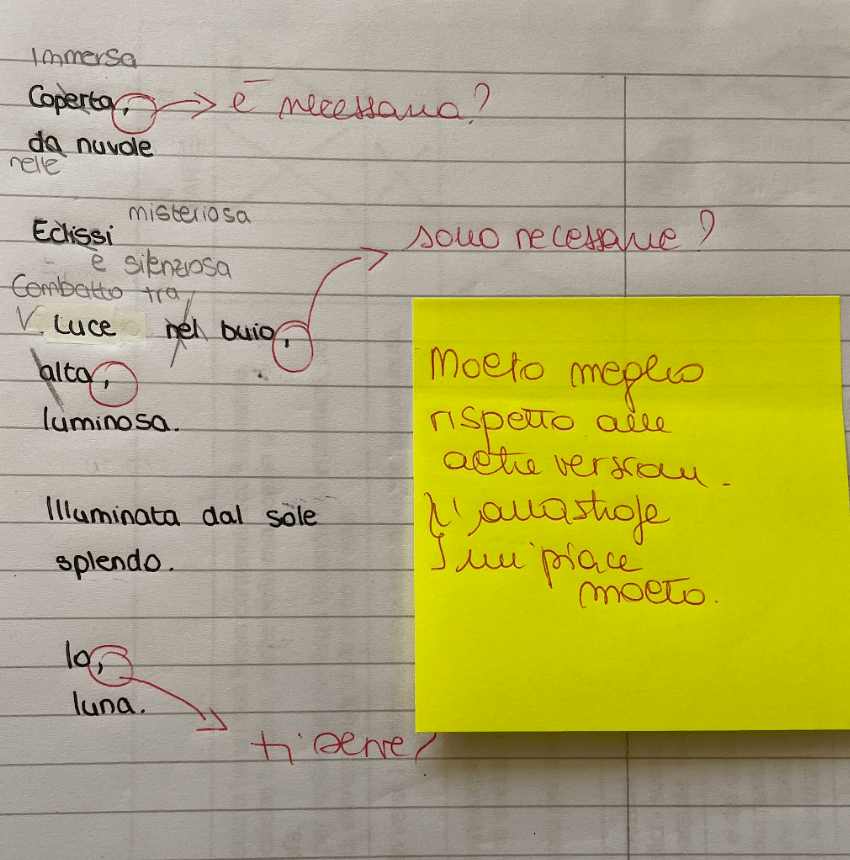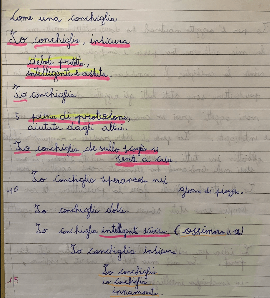 Diversamente da quanto faccio di solito (tante, tante, tantissime sessioni di prescrittura) questa volta ho deciso di proporre una sola strategia in questa fase del processo per concentrarmi di più sulla revisione. Ho optato per questa possibilità perché durante l’immersione ragazzi e ragazze avevano iniziato in autonomia a scribacchiare sui loro taccuini alcuni versi che non volevo andassero persi e che potevano essere considerati una forma embrionale di poesia “naturalmente” autobiografica.