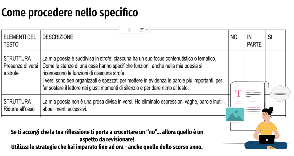Insegnamento chiave: utillizzare una rublist per individuare quali aspetti revisionare del proprio testo poetico e per progettare le modalità di intervento sul pezzo. (Naturalmente nella rublist erano indicate anche strategie apprese l’anno precedente. Quella che vedete qui è una delle slide proposte durante la ML. Per la rublist al completo potete cliccare qui: Rublist poesia II)
