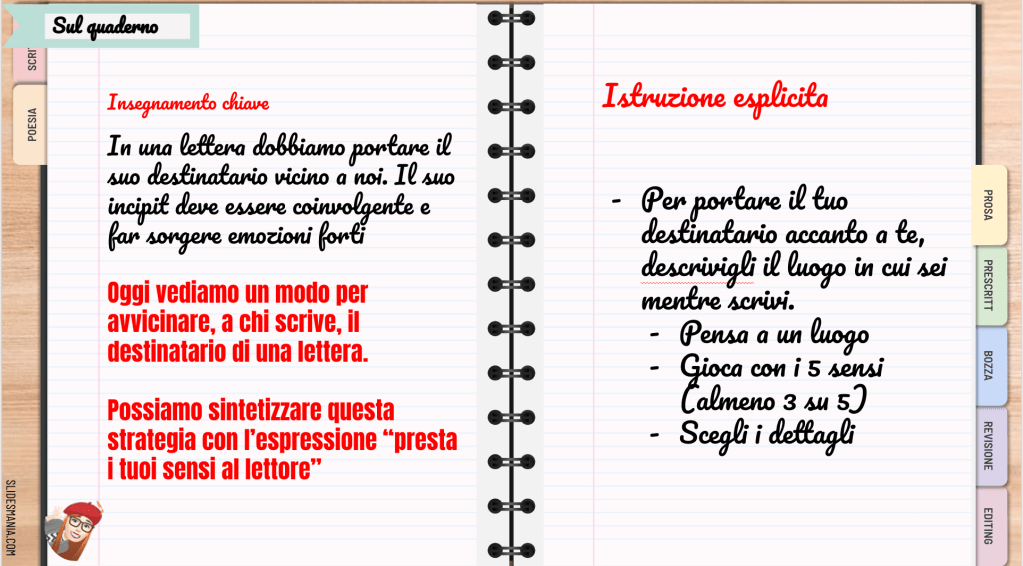 Si tratta di una strategia molto basica che sostanzialmente si propone di sviluppare la capacità di descrivere un’ambientazione utilizzando i 5 sensi. È utile per praticamente tutti i generi e le tipologie testuali: per questo ho deciso di proporla proprio ora, prima dell’avvio ufficiale del primo percorso di prosa dell’anno – la scrittura autobiografica. So già che la riprenderò più volte nel corso di tutto il triennio: ci servirà per introdurre nei nostri racconti sequenze descrittive, per andare a scegliere i dettagli dell’ambientazione più efficaci per presentare un personaggio, per trasformare i fatti in scene quando ci occuperemo di nonfiction.