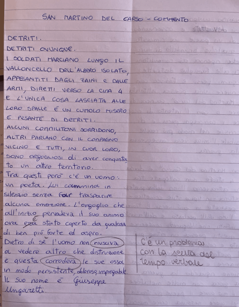 Nelle fotografie che seguono potete leggere Giulia ed Ettore, in prima, alle prese con il coinvolgimento attivo della strategia appena riassunta, ma anche Zaid che in terza afferma – attraverso una descrizione – che San Martino del Carso è stata composta da Giuseppe Ungaretti.