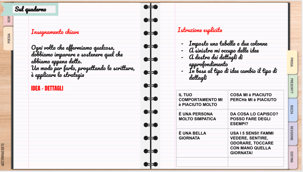 La seconda strategia proposta ai primini e alle primine, quella “scacciastiledidascalico” è ugualmente una strategia stranota a chi bazzica un po’ di scrittura: quella che consiste nell’approfondire le idee con dei dettagli. In classe l’ho affrontata inizialmente in lettura, durante le ore di storia, come strategia per la comprensione del testo informativo. Anche per questo l’ho presentata a ragazzi e ragazze: volevo dar loro prova tangibile che ciò che imparano da lettori lo possono mettere in pratica da scrittori e viceversa.