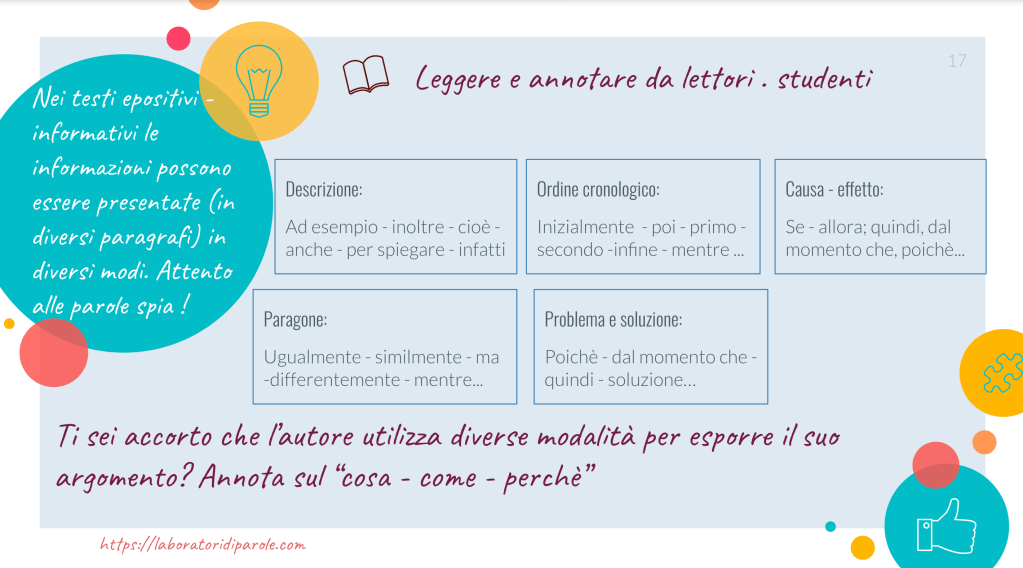 Una strategia molto utile in questo senso, anche perché obbliga a rallentare nella lettura e a sostare tra e nelle parole, è quella che invita alunni ed alunne a mettere in luce le “parole spia” che introducono un certo tipo di informazioni.