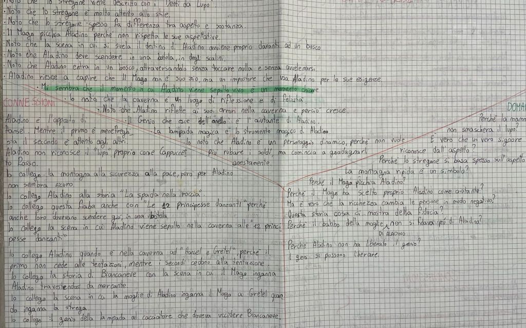 - 1) Lettura ad alta voce (io) e ascolto attivo (loro). Ho chiesto ai ragazzə di preparare, sulla doppia pagina interna di un foglio protocollo, uno schema ad Y. Dopo aver esplicitato nuovamente alla classe gli obiettivi che hanno guidato il nostro percorso, ho proposto la lettura ad alta voce di Aladino e la lampada magica, di Nadia Terranova e Lorenzo Mattotti. Ho optato per un testo illustrato (da Mattotti!) sia per sostenere l’attenzione di tuttə sia per facilitare l’accesso di lettori e lettrici ad alcuni degli elementi simbolici presenti nella fiaba. Durante il procedere della lettura ə ragazzə hanno annotato all’interno dello schema ad Y impressioni, connessioni e domande, facendo attenzione a concentrarsi soprattutto sugli elementi che sarebbero stati oggetto di valutazione.